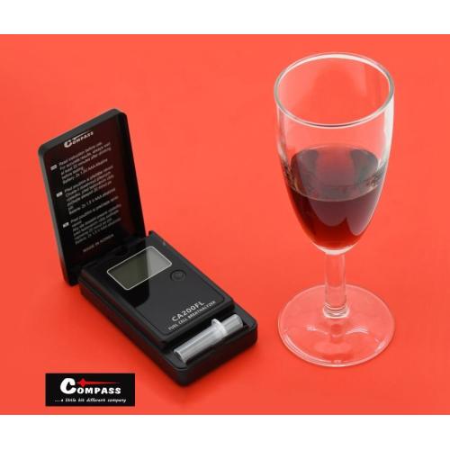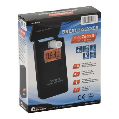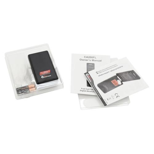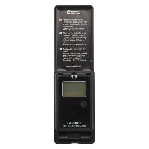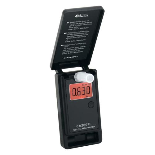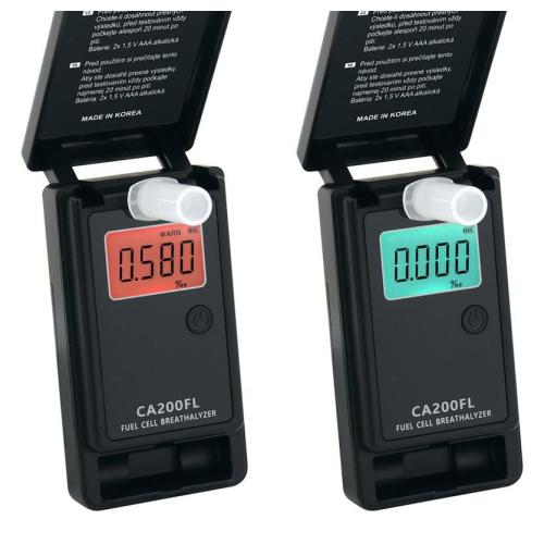 Kapesní model digitálního testeru, přístroje pro orientační stanovení obsahu alkoholu v krvi dechovou zkouškou. Je vybaven účinným elektrochemickým senzorem, který zaručuje zrychlený zahřívací proces, rychlou odezvu, přesné a stabilnější výsledky měření. Je osazen přehledným displejem s podsvícením. Pracuje s rozsahem měření 0 - 4‰ alkoholu v krvi, s napájením 2x baterií 1,5V AAA. Přístroj je navíc opatřen samodiagnostickým systémem, který vyhodnocuje různé stavy jako okolní teplota, stav baterií nebo nutnost kalibrace alkoholtesteru. Upozornění - Pro kalibraci přístroje je potřeba uvézt označení alkotesteru - CA 200FL. Rozměry: 52 x 92,5 x 23,5 mm.