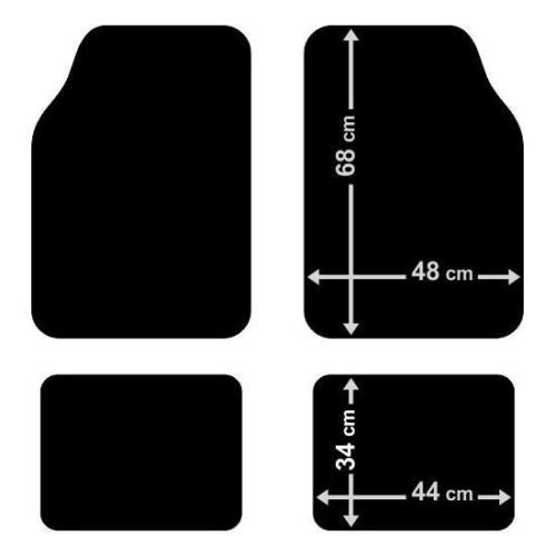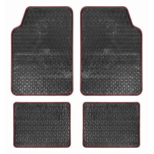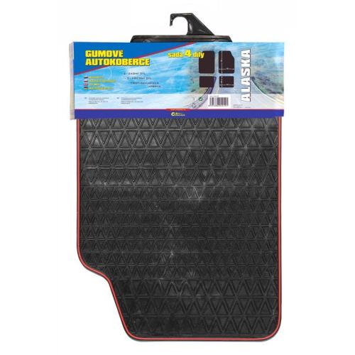 Univerzální gumové koberce do automobilu, s protiskluzovou úpravou. Sada 4 ks (2x přední, 2x zadní díl), materiál guma, provedení černé s červenou linkou. Velikost předního koberce 68 x 48 cm, zadního 34 x 44 cm.