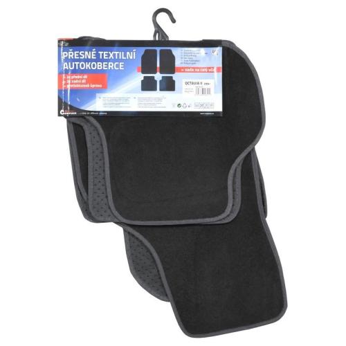 Přesné textilní autokoberce pro Škoda Octavia 2004 - 2008. Sada 4 ks (2x přední, 2x zadní díl). Provedení černé s šedým lemem a šedým zesílením koberce řidiče pod pedály.