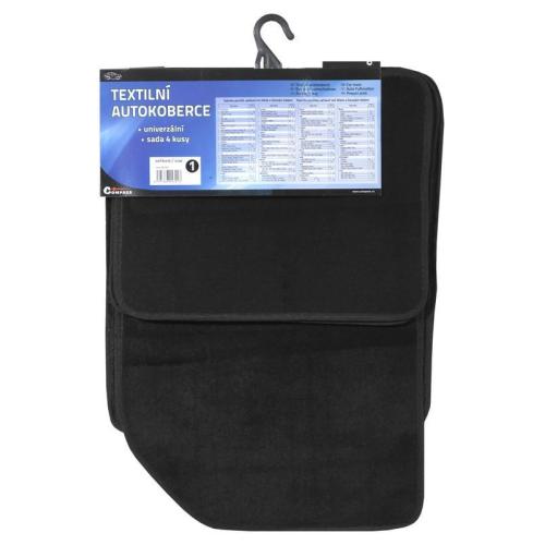 Koberce textilní UNI 1 černé   sada 4 ksUniverzální textilní koberce do automobilu. Sada 4 ks (2x přední, 2x zadní díl). Na obalu je tabulka základních typů vozidel, na které lze koberce použít. ... celý popis »