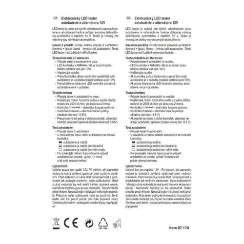 tech-info: LED tester je určen pro rychlé vyhodnocení stavu autobaterie a dobíjecí soustavy (alternátoru) automobilů s napětím 12V. Tester je vhodný pro všechny typy olověných akumulátorů. Je vybaven svorkami pro přímé připojení k akumulátoru, má 3 základní měřící funkce: test autobaterie, alternátoru a autobaterie při startování.