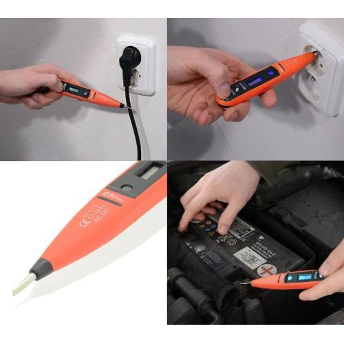 tech-info: Zkoušečka k měření napětí 12 až 250 V. Pracuje na indukční bázi, nebo jako běžná zkoušečka. V indukčním provozu dokáže najít napětí i přez izolaci kabelu, je li tento pod napětím a v případě poškození vodiče najde místo přerušení (u střídavého napětí). Hodnoty napětí se zobrazují v pěti stupních na LCD displeji (12, 36, 55, 110 a 220V). Stejnosměrné napětí 12 -36V, střídavé 12 - 250V.