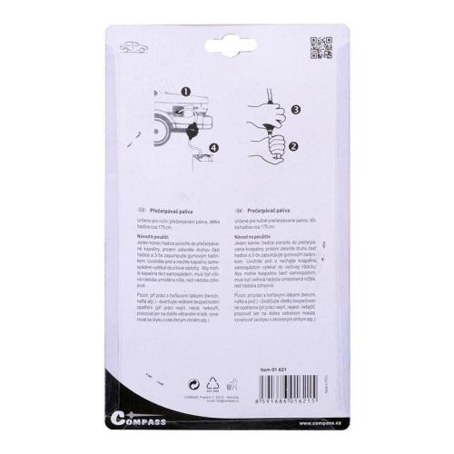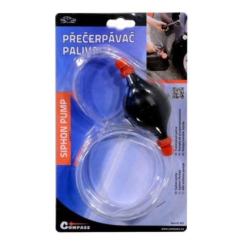 Určeno pro ruční přečerpávání paliva, délka hadice cca 180 cm. Snadné použití - jeden konec hadice ponořte do přečerpávané kapaliny, prstem utěsněte druhou část hadice a 3-5x zapumpujte gumovým balónkem. Uvolněte prst a nechte kapalinu samospádem vytékat do cílové nádoby. Aby mohla kapalina téct samospádem, musí být cílová nádoba umístěna níže, než nádoba zdrojová.