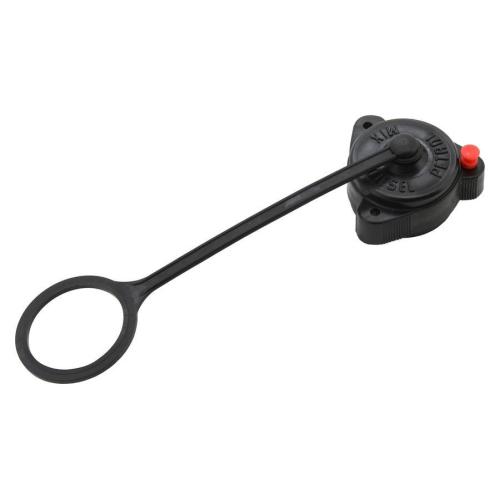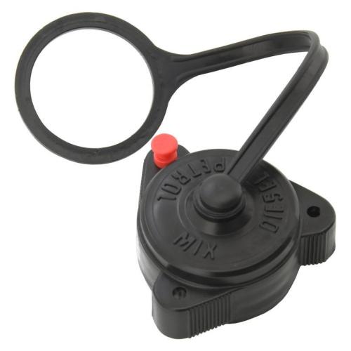 Plastové náhradní víčko pro plastový kanystr na pohonné hmoty tvořeno třemi částmi. Zajišťovací páskou z měkkého a ohebného plastu, kolíčku pro určení obsahu kanystru a samotným víčkem pro uzavření kanystru.