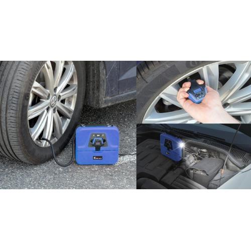 Digitální vzduchový kompresor v kompaktním provedení. Napájení 12V, 280 cm dlouhý kabel se zástrčkou do autozapalovače. Adaptéry pro huštění míčů, matrací nebo bazénů, 4x náhradní čepička k ventilku Auto stop - kompresor nahustí pneumatiku na předem nastavený tlak a následně automaticky kompresor vypne. Vestavěný odnímatelný pneuměřič (do 7 Atm)zobrazuje naměřený tlak v několika různých jednotkách. Vestavěná svítilna 9x LED pro osvětlení pracovního prostoru. Před použitím důkladně pročtěte přiložený návod.