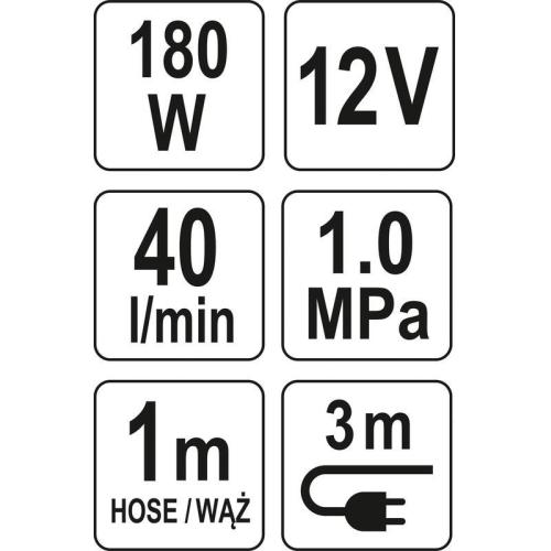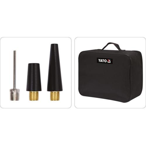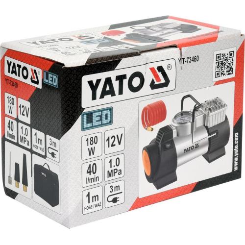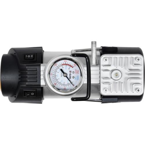 Výkonný kompresor s přesným manometrem, napájením na 12V a s LED svítilnou. Určeno pro nafukování pneumatik vybavených ventilem v automobilech, motocyklech a jízdních kolech a - s použitím výměnných špiček - matrace, pontony, míče. Délka přívodního kabelu 300 cm, délka hadice 100 cm, max. tlak 1 MPa, průtok vzduchu 40 l/min.