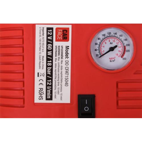 Kompresor CarFace s vysokým pracovním tlakem až 18 barů je praktickým pomocníkem při nafukování pneumatik aut a jízdných kol, sportovního a kempingového vybavení a mnoha dalších předmětů. Součástí kompresoru je vestavěný tlakoměr a 3 nafukovací nástavce na kola, motocykly a míče. Kompresor je napájen z 12V zásuvky zapalovače v autě.