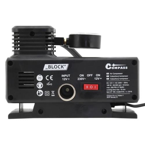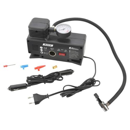 Vzduchový kompresor s vysokou účiností a napájením 12/230V. Kompresor je vhodný k huštění pneumatik osobních automobilů, motocyklů či jízdních kol. Součástí balení jsou přídavné adaptéry pro různé použití (huštění míčů, matrací, bazénů a pod.). Napájecí kabely i hustící hadice mají dostatečnou délku: 12V - 260 cm / 230V - 150 cm a hadice 50 cm. Komprosor je vybavený vestavěným pneuměřičem, který zobrazuje naměřený tlak v několika jednotkách.