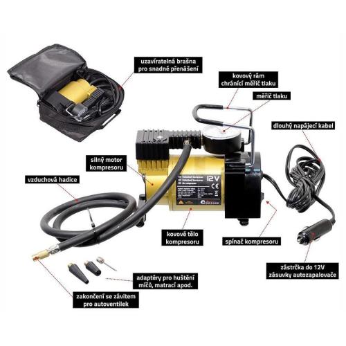 Vzduchový kompresor vybavený měřičem tlaku s koncovkou pro klasický autoventilek. Napájení 12V, kabel se zástrčkou do zásuvky automobilového zapalovače. Součástí balení jsou přídavné adaptéry pro huštění gumových matrací, míčů apod. Kompresor je vhodný k huštění pneumatik osobních automobilů, dodávek i vozů 4x4, vyvine max. tlak 6,5 kg/cm2 (BAR).