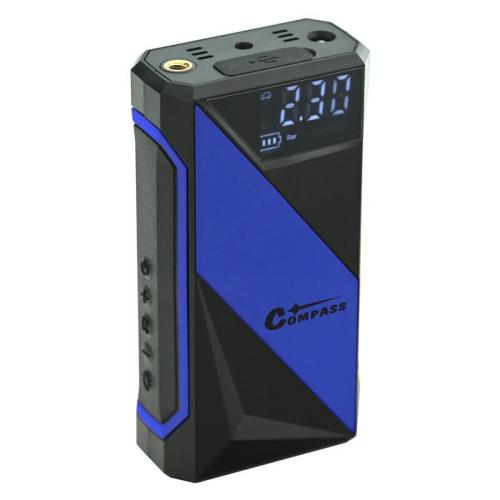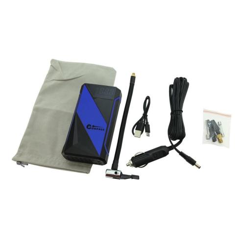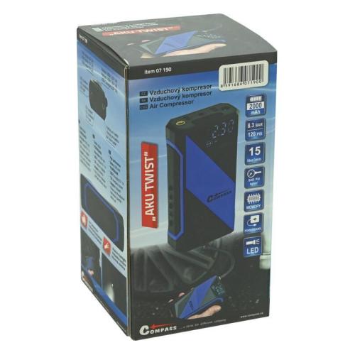- Akumulátorový vzduchový kompresor v kompaktním provedení s funkcí Powerbanky ( 2000 mAh ). Kompresor je vhodný k huštění pneumatik osobních automobilů, motocyklů, jízdních kol, míčů a dalších nafukovacích výrobků. Adaptéry jsou součástí balení. Kompresor je vybaven funkcí pro automatické nahuštění na předem nastavený tlak. Displej přehledně zobrazuje přednastavené hodnoty, i aktuální tlak huštěného předmětu v několika různých jednotkách. Kompresor je možné používat i jako Powerbanku pro napájení USB zařízení. Čelní strana je navíc opatřena vestavěnou LED svítilnou pro osvětlení pracovního prostoru. Nabíjení akumulátoru kompresoru je řešeno pomocí USB-C kabelu. Stav akumulátoru je zobrazen na displeji. Pro nouzové použití (při vybití akumulátoru) je možné kompresor napájet pomocí 12V konektoru.