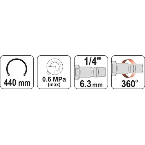 Vzduchová pistole nafukovací vhodná pro profesionální využití, např. huštění kol. Tělo je opatřeno neklouzavým ergonomickým povrchem. Manometr s max. pracovním tlakem 6 bar, a 40 cm hadice. Připojení k systému stlačeného vzduchu je řešeno 1/4" otočnou spojkou.