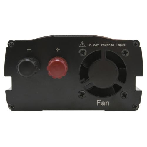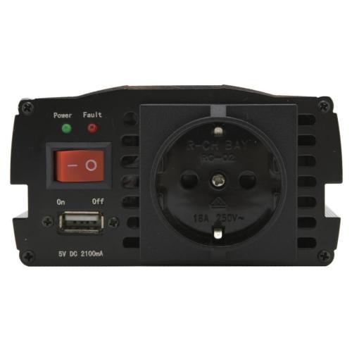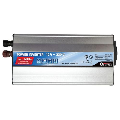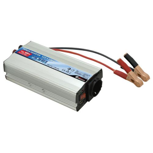 Vysoce výkonný měnič určený pro univerzální použití, kdy je potřeba připojit síťové spotřebiče určené pro 230V/50Hz v místech s rozvodem 12 V=. Připojení napájecího napětí je řešeno pomocí klipsů z akumulátoru 12V. Výstup měniče je osazen běžnou zásuvkou 230V evropského typu pro spotřebiče bez zemnícího kolíku tj "dvoukolíková" zástrčka. Navíc je k dispozici USB zásuvka (5V 2100mA)vhodná pro MP3 přehrávače, mobilní telefony a další zařízení. Dále je měnič vybaven vypínačem, kontrolkami provozu a signalizací nežádoucích stavů. Rozměry měniče 200 x 100 x 55 mm. Max. trvalý příkon 600 W, max. špičkový příkon 1200 W, délka kabelů 700 mm s klipsy, chlazení - vestavěný ventilátor, vstupní pojistka 2x 35A.