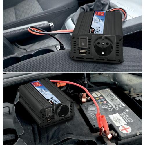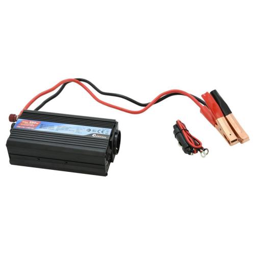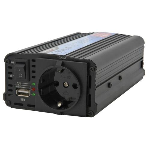 Vysoce výkonný měnič určený pro univerzální použití, kdy je potřeba připojit síťové spotřebiče určené pro 230V/50Hz v místech s rozvodem 12 V=. Připojení napájecího napětí je řešeno zástrčkou do zásuvky autozapalovače 12V nebo pomocí klipsů z akumulátoru 12V. Výstup měniče je osazen běžnou zásuvkou 230V evropského typu pro spotřebiče bez zemnícího kolíku tj "dvoukolíková" zástrčka. Navíc je k dispozici USB zásuvka (5V 1000mA)vhodná pro MP3 přehrávače, mobilní telefony a další zařízení. Dále je měnič vybaven vypínačem, kontrolkami provozu a signalizací nežádoucích stavů. Rozměry měniče 180 x 100 x 55 mm. Max. trvalý příkon 550 W, max. špičkový příkon 1100 W, kabeláž:50 cm s klipsy a 45 cm se zástrčkou do autozapalovače, účinnost 90 %, chlazení - vestavěný ventilátor, vstupní pojistka 2x 40A.
