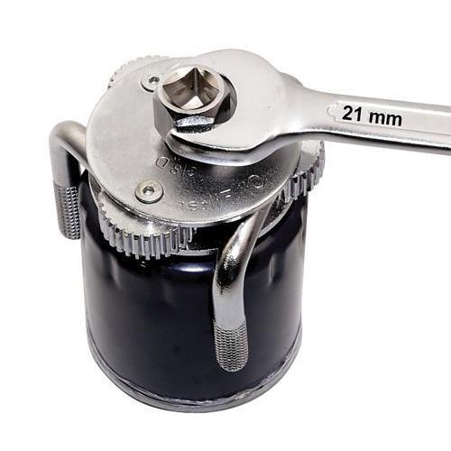 Univerzální klíč pro montáž a demontáž olejových filtrů. Pro filtry o průměru 65 - 125 mm. Vhodný i pro auta se zúženou pracovní oblastí. Celokovová konstrukce, povrchová úprava, zdrsnění (zuby) na upínacích ramenech pro pevný záběr při uvolňování nebo utahování olejového filtru. Klíč se nasadí na olejový filtr a pomocí ráčny (1/2") nebo stranového či nástrčného klíče (21mm) se olejový filtr utáhne či povolí.