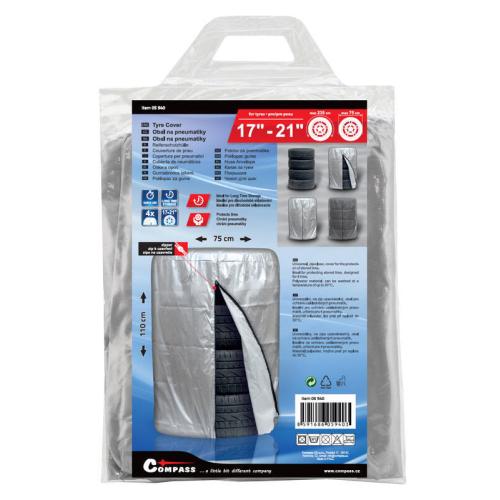 Obal s rozměry 750 x 1100 mm pro uložení sady pneumatik. Obal je opatřen uzavíráním na zip a je vyroben z polyesteru, který dlouhodobě chrání pneumatiky před znečištěním. Spodní část je navíc po obvodovou doplněna stahovací šnůrou. Ideální řešení pro bezpečné a čisté uskladnění vašich pneumatik. Vhodné pro pneumatiky s max. vnějším průměrem 750 mm se šíří max. 275 mm. Ideální pro kola velikosti 17" - 21".