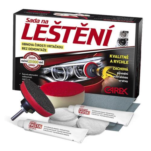 - Leštící sada pro obnovení čirosti světlometů, bez narušení původní tvrzené vrstvy a bez zapříčinění stárnutí světlometů. Tato sada je určena na oživení a navrácení čirosti světlometů povrchově zašedlých, zežloutlých, zmatněných, které nejsou poškozené do hloubky, nejsou popraskané, ani výrazně poškrábané. Pro přeleštění světel pomocí vrtačky. Leštění se provádí mechanicky, bez odstranění originálního krycího UV laku a bez chemického znehodnocení povrchu světlometu. Leštící pasta CAREX je na vodní bázi, není tedy chemicky agresivní, jako pasty konkurenční, určené vesměs pro leštění ruční. Obsahuje: