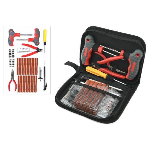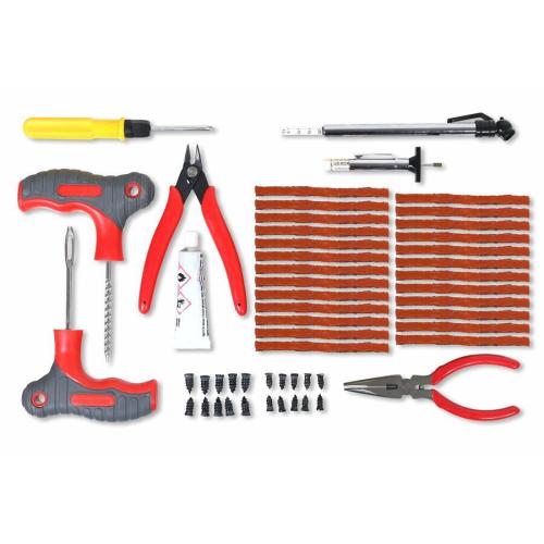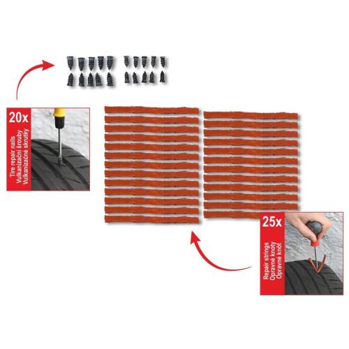Sada na rychlou opravu bezdušových pneumatik bez nutnosti demontáže pláště z disku. Tato sada je vhodná na bezdušové pneumatiky automobilů, motocyklů, čtyřkolek a dalších. Sada obsahuje klasické opravné knoty včetně veškerého nářadí potřebného pro opravu, ale také vulkanizační šrouby, které opravu pneumatiky ještě více zjednoduší. Vulkanizační šrouby jsou speciální samořezné šrouby s hrubým závitem a vrstvou těsnicí hmoty. Součástí sady jsou rovněž další nástroje pro kontrolu stavu pneumatik, měříč hloubky dezénu a tlakoměr. Sada je úhledně zabalena v textilním kufříku s rozměry 205 x 145 x 40 mm.