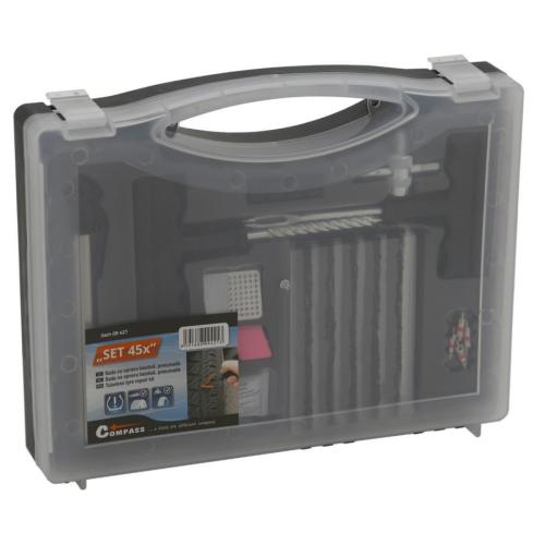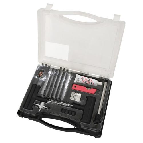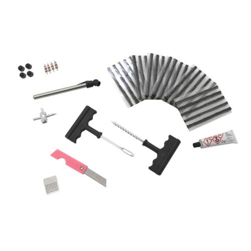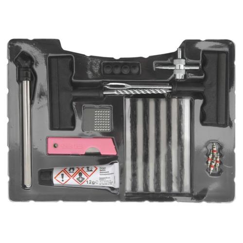• Obsahuje vrták(průtažník), vidlici, knot (30x), vukanizační roztok, nůž, ventilky(4x), čepičky (4x), brusný plíšek a měřič. Upozornění: Nelze požít na opravy bočnic pneumatiky.