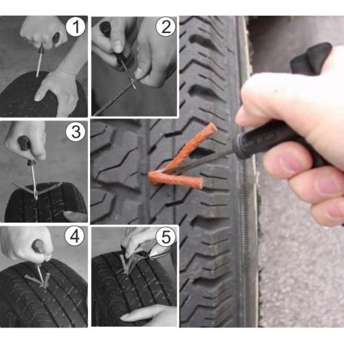 Sada na rychlou opravu bezdušových pneumatik bez nutnosti demontáže pláště z disku. Je vhodná pro automobily, motocykly, čtyřkolky a další bezdušové pneumatiky. Návod k použití: