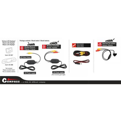 - Bezdrátová parkovací kamera s úhlem záběru 120°. Kamera je tvarována pod úhlem a je opatřena šroubem s maticí pro bezpečné uchycení. Zajištěno tak je snadné umístění nad spz v zadní části vozu. Balení obsahuje 1x kameru, bezdrátový vysílač a přijímač video signálu, kompletní kabeláž pro propojení s napájením i vysílačem a přijímačem a pro případ potřeby i kabeláž (5,5m) pro přímé propojení bez bezdrátového přenosu. Celá sada je zakončena cinch konektorem, který je možné zapojit do libovolného displeje s video vstupem. V našem sortimentu jsou dostupné různé displeje vhodné pro umístění do auta. Samotná kamera disponuje pomocnou parkovací trajektorií. Technická data: