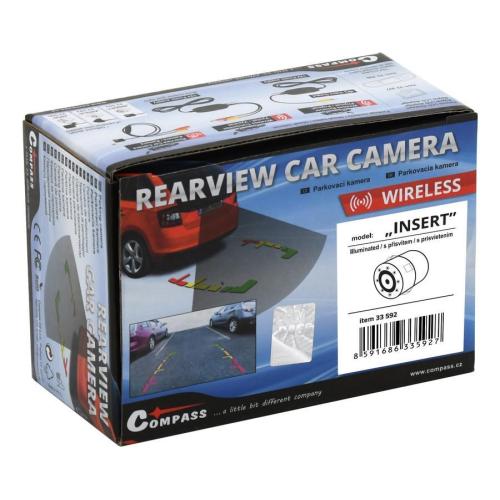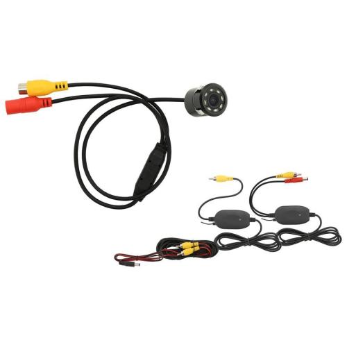 - Bezdrátová parkovací kamera s úhlem záběru 120°. Kamera je tvarována jako klasické parkovací senzory a je určena k umístění do předem vytvořeného otvoru (18,5 mm). Balení obsahuje 1x kameru, bezdrátový vysílač a přijímač video signálu, kompletní kabeláž pro propojení s napájením i vysílačem a přijímačem a pro případ potřeby i kabeláž (5,5m) pro přímé propojení bez bezdrátového přenosu a vrták pro předvrtání otvoru pro kameru. Celá sada je zakončena cinch konektorem, který je možné zapojit do libovolného displeje s video vstupem. V našem sortimentu jsou dostupné různé displeje vhodné pro umístění do auta. Samotná kamera disponuje pomocnou parkovací trajektorií a LED přísvitem. Technická data: