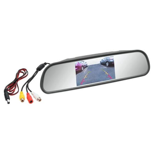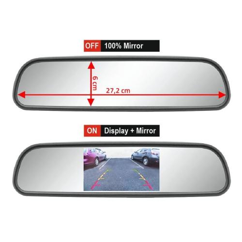 - Přídavné zrcátko se zabudovaným LCD displejem, ideální pro použití s parkovací kamerou i k přehrávání NTSC/PAL videí z jakéhokoliv přehrávače s výstupním Cinch (RCA) kabelem. Pomocí zabudovaných klipů (50-75 mm) je snadné toto zrcátko jednoduše nasadit na většinu běžných zpětných zrcátek v automobilu. Rozměry zrcátka s displejem 272 mm x 60 mm. Samotný displej s úhlopříčkou 4,3" má rozměry 94 x 53 mm. Díky jedinečné technologii není ve vypnutém stavu displej vůbec viditelný a celá plocha zrcátka je tak využitelná jako standartní zpětné zrcátko. Díky inteligentnímu software zařízení, je po zjištění signálu ve video vstupu automaticky aktivován obraz videa. Přednostní vstup AV2 je určen pro parkovací kameru, jejíž obraz bude vždy nadřazený a bude zobrazen vždy, když bude parkovací kamera aktivní. Technická data:
