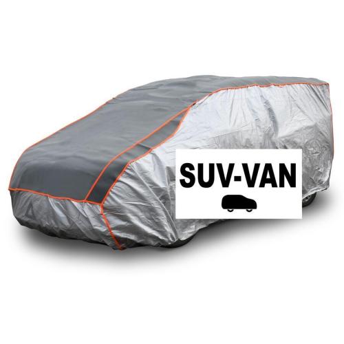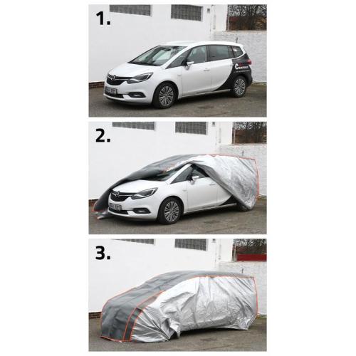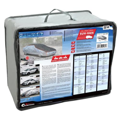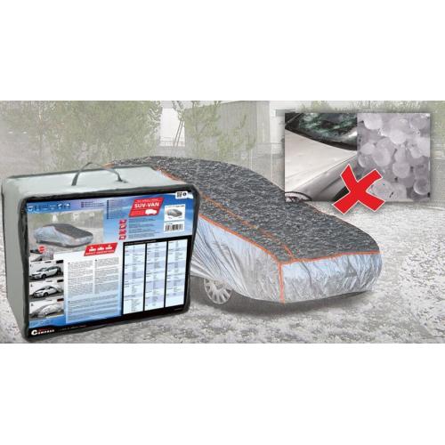 Ochranná plachta proti krupobití, k překrytí celého vozidla s vysokou odolností proti povětrnostním vlivům. Horní část vyztužená zesíleným materiálem, který dokáže absorbovat nárazy krup při krupobití a tím zamezí poškození vozidla. Jednoduché upevnění plachty - pouze se nasadí na automobil, na spodku se upevní část s všitou gumou za vhodné záhyby karoserie / nárazníku a přední i zadní část plachty se důkladně upevní pomocí všitých popruhů se sponami. Absorpční efekt plachty proti nárazu ledových krup je vysoce účinný až do velikosti kroupy cca 12 mm s nárazovou rychlostí do 74 km/h. Při překročení těchto hodnot není ochranný účinek zaručen. Tabulka použití na jednotlivé vozy je součástí obalu.
