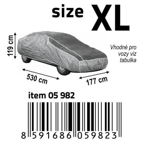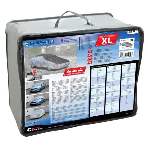 Ochranná plachta proti krupobití, k překrytí celého vozidla. Vysoká odolnost proti povětrnostním vlivům, voděodolná. Horní část vyztužená zesíleným materiálem, který dokáže absorbovat nárazy krup při krupobití a tím zamezí poškození vozidla. Jednoduché upevnění plachty - pouze se nasadí na automobil, na spodku se upevní část s všitou gumou za vhodné záhyby karoserie / nárazníku a přední i zadní část plachty se důkladně upevní pomocí všitých popruhů se sponami. Tabulka použití na jednotlivé vozy je součástí obalu.