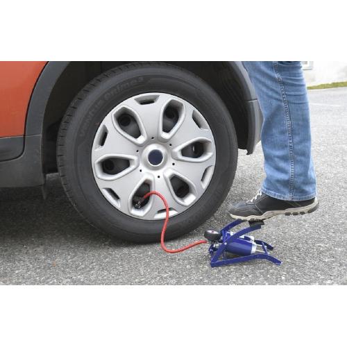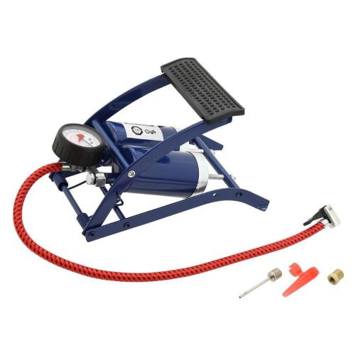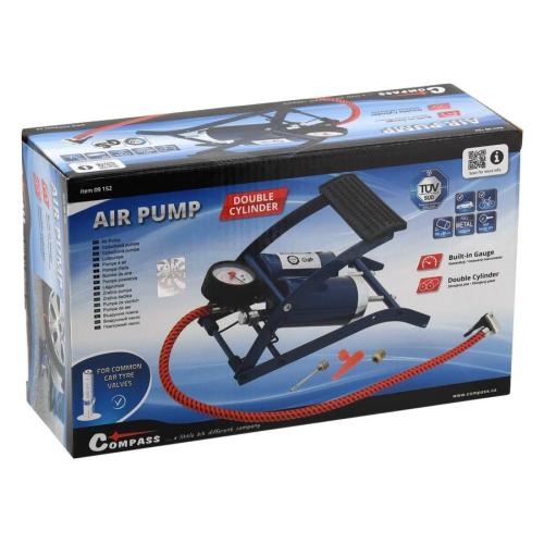 tech-info: Kovová nožní dvoupístová hustilka s manometrem, určená pro huštění pneumatik osobních automobilů. Součástí balení jsou přídavné adaptéry pro huštění gumových matrací, míčů apod.
