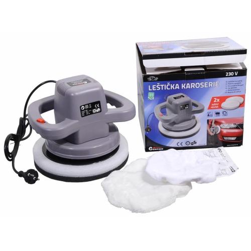 Leštička karosérií usnadňuje leštění a ošetřování karosérií automobilů i jiných ploch, u kterých se takové zákroky provádějí. Napájení 220 V, vyměnitelné leštící potahy kotouče pro nanášení i leštění. Součástí balení jsou i dva kryty (návleky) na leštičku. Návod k použití: Na leštící kotouč nasaďte leštící kryt (návlek). Na kryt leštícího kotouče naneste slabou vrstvu leštící pasty. Přiložte leštičku na karoserii zbavenou nečistot a zapněte ji. Leštičkou pohybujte po karosérii (používejte pouze mírný tlak). Před sejmutím z karoserie přístroj vždy nejprve vypněte. Po vyleštění celé karoserie hrubým krytem jej sejměte a nasaďte kryt jemný. Celou karoserii opět vyleštěte jemným krytem bez požití leštící pasty. Technická data : napájení 230 V~, 50 Hz, příkon 120 W, otáčky 3100/min, průměr leštícího kotouče 240 mm.