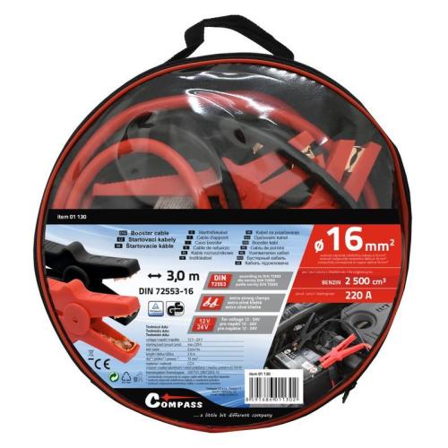 Kabely jsou vyrobeny z mědí potažených hliníkových kabelů vodivostí odpovídající měděnému kabelu o průměru 16 mm2. Jsou izolovány a vybaveny kompletně izolovanými kleštěmi pro připojení k akumulátoru. Odpovídají požadavkům evropské normy DIN 72553-16 a jsou způsobilé pro napětí od 12 do 24V. Jsou určeny pro nouzové startování vozidel s benzinovým motorem do objemu 2500 cm3. Délka 3 m. Pomocí startovacích kabelů lze nastartovat vozidlo s vybitou baterií připojením k vozidlu s nabitou baterií. Spojovány mohou být pouze baterie se stejným napětím (12V nebo 24V) a přibližně stejnou kapacitou (Ah).