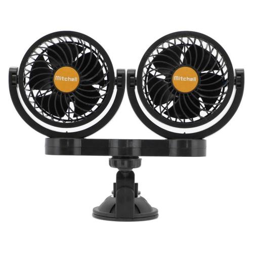 tech-info: Praktická sestava dvou nastavitelných ventilátorů s robustním stojanem na kloubu s přísavkou. Napájení 24V ze zásuvky autozapalovače. Ventilátory průměru 110 mm lze natočit díky kulovému kloubu a zároveň lze každý větrák zvlášť nasměrovat prakticky jakýmkoliv směrem díky otočnému mechanismu na stojanu. Ventilátory jsou vybaveny silnou přísavkou pro snadné a důkladné upevnění. Vynikají tichým chodem a nízkou spotřebou proudu. délka kabelu 240 cm, rozměr sestavy 265 x 150 x 70 mm.
