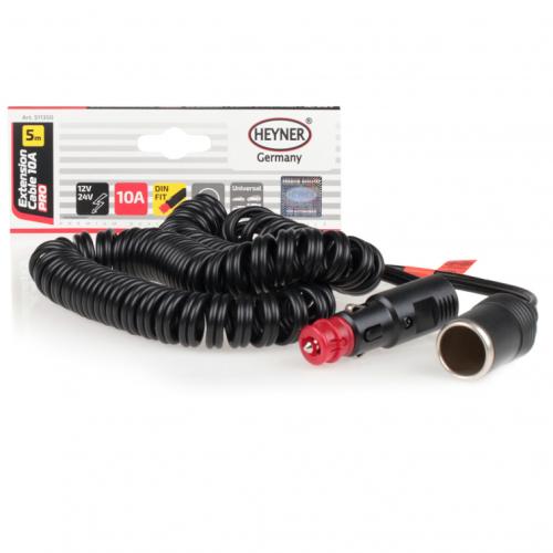 Prodlužovací kabel HEYNER® 10 A PRO je prémiový prodlužovací kabel, který umožňuje snadné napájení pro vzdálenější elektrická zařízení (12/24 V). Díky extra dlouhému spirálovému kabelu 5 m a zástrčkám, které jsou vhodné do zapalovače cigaret i standardních zásuvek DIN, je mimořádně všestranný.