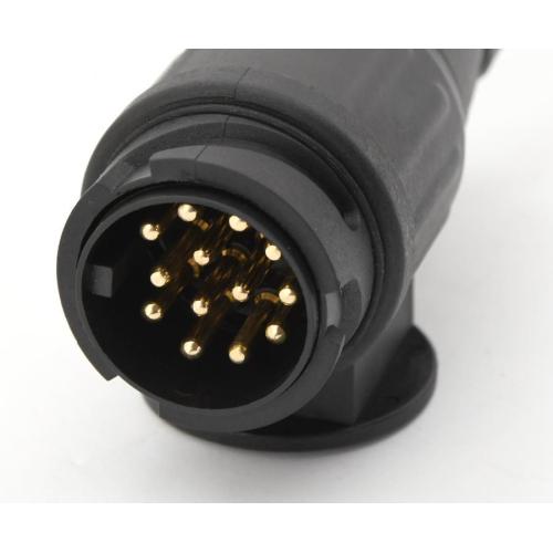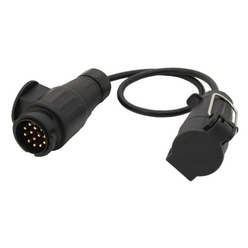 Redukční kabel (vhodný i jako redukční adaptér) pro tažná zařízení automobilu a přívěsu. Vhodné pro použití s napětím 12-24 V, délka 600 mm. Určeno pro vozidlo s 13-ti pólovou zásuvkou (dle DIN 11446) a přívěs se 7-mi pólovou zástrčkou (dle DIN 1724). 7-mi pólové zásuvky a zástrčky se obvykle používají u starších vozidel a přívěsů, 13-ti pólové pak u nových tažných zařízení a přívěsů.
