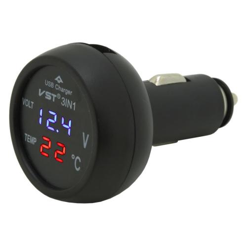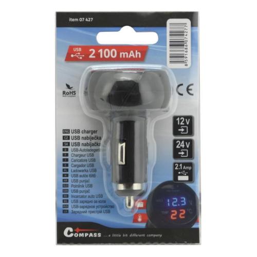 Adaptér umožňující napájet / nabíjet USB zařízení z 12/24V zásuvky autozapalovače. Vhodné pro mobilní telefony, MP3 přehrávače a další zařízení, která se nabíjejí / napájejí běžným USB zdrojem 5V až do příkonu 2100 mA. Vždy používejte nabíjecí (napájecí) kabel, při použití datového kabelu nemusí nabíjení / napájení fungovat korektně. Displej na čelní straně adaptéru zobrazuje střídavě teplotu ve voze a aktuální napětí, dodávající autobaterie.