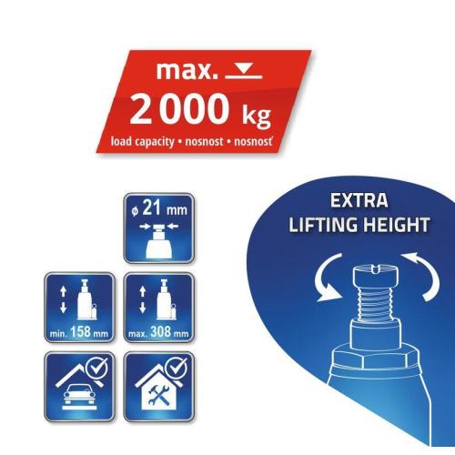 Hydraulický hever "panenka", nosnost 2 000 kg, zdvih 165 - 315 mm. Homologace TÜV/GS.